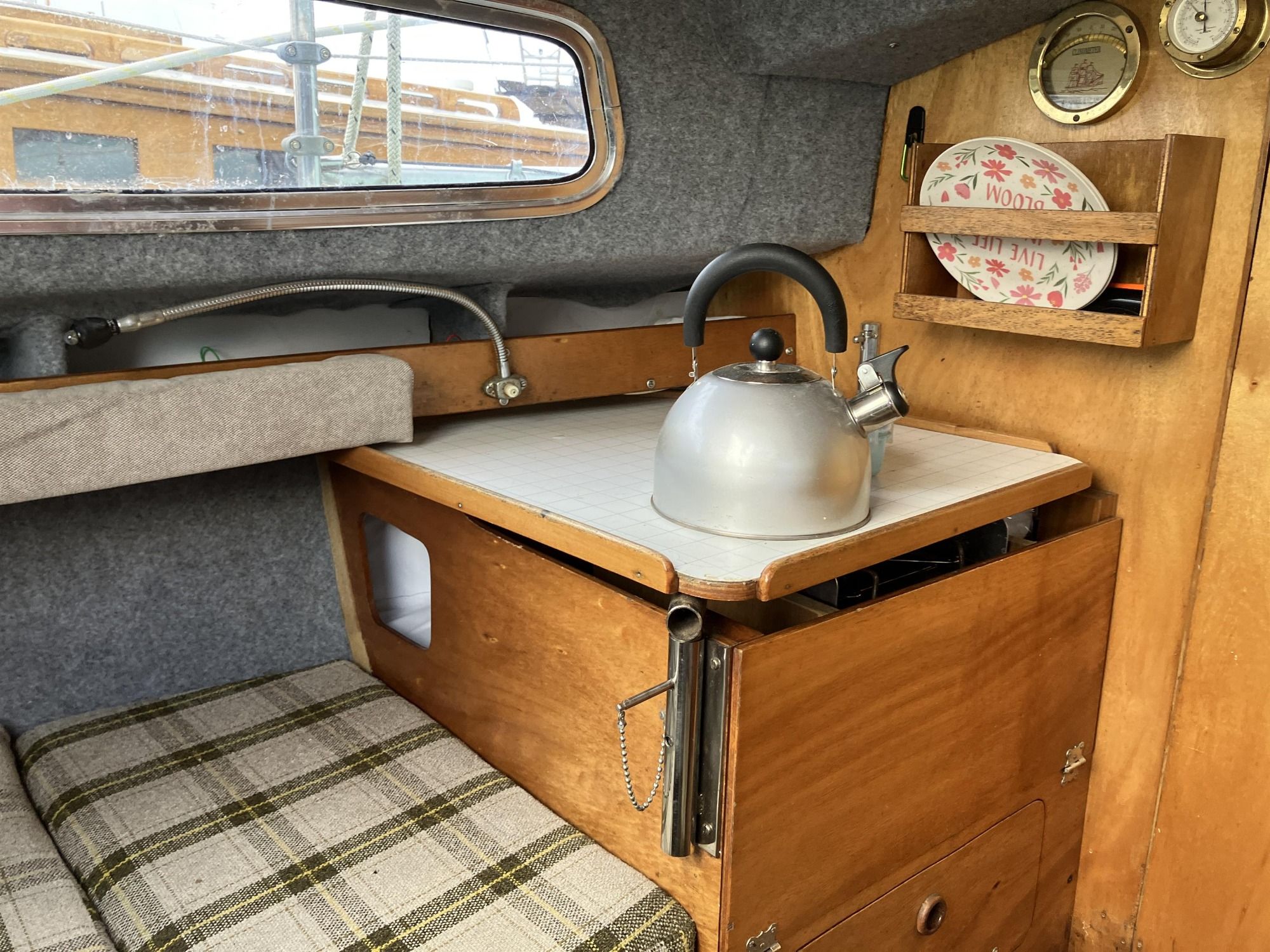 She features a bilge keel and a sturdy GRP construction with moulded timber strengthens in critical load spaces, ensuring durability. She has been updated extensively over the last 2-3 years, making her a ready-to-sail vessel. Recent updates include a full rewire in 2022, a new gooseneck fitting in 2023, and a new Saunders mainsail also from 2023. The Hyde genoa, while ten years old, remains in good condition.