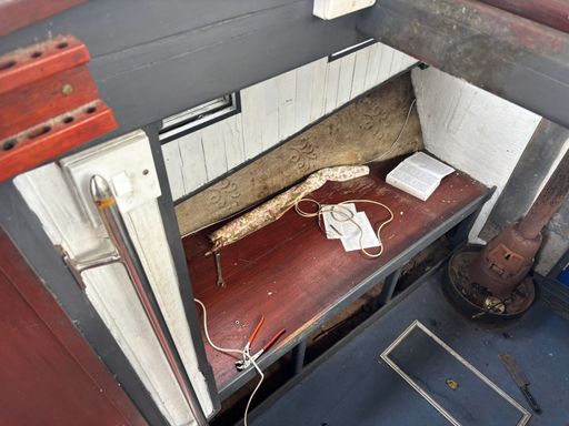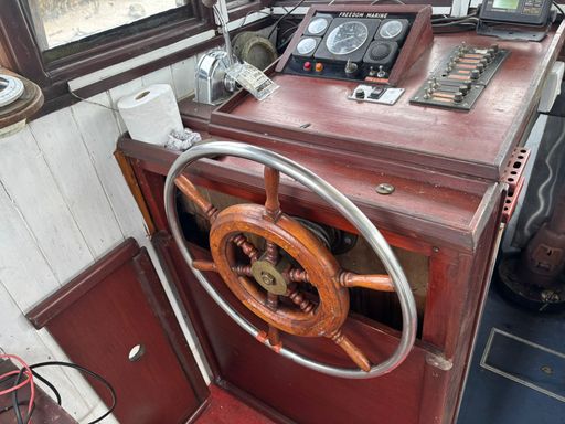 It has been reported that in her current condition, she is not able to steer with the helm due to cable breaking. She can currently be controlled by a tiller at the rear. Although she is watertight, she does accumulate a small amount of water, which is regularly pumped out by the current owner of the boat. Her engine we believe is an old ford diesel engine. She has a coal heater, heads, oven and microwave. We believe she also has a fishfinder/radar, but unsure if it is working condition.