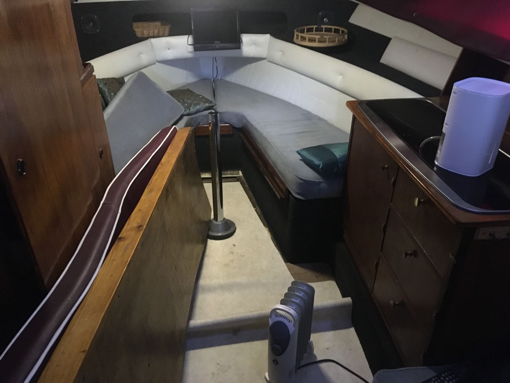 Tiffin has the Icom VHF with DSC capability (linked to the GPS), a Garmin GPS unit, Garmin Echo sounder/fish finder, Magnetic Compass. The cabin has a two burner gas stove, there is a fridge in the cockpit which runs from the 12v supply. There are two batteries (Engine and Domestic), which are charged by the engine or 12v 30amp power supply when connected to domestic supply. The petrol tank has a capacity of 220 litres. There is a 25 litre fresh water tank (not drinking water) which supplies the sink and the sea toilet flush. She has an anchor (plough) with 3m of chain and 10m of rope. There are two bilge pumps (engine bay and cabin).