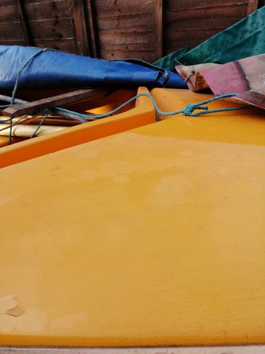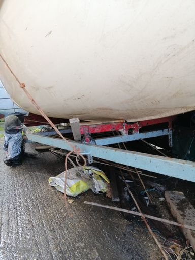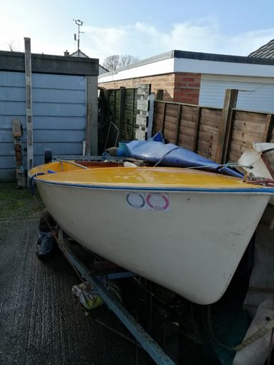 This boat is a Mk3 Gull Dinghy with a white hull and a yellow deck. She has been covered on the trailer for the past 10 years. As seen in the photographs, the boat comes with the expected amount of wear for a cruising dinghy of its age (1980's) She comes as a full boat (mast,oars,sails,rudder), however due to age the rigging will probably require replacing. She has a launching trolley in usuable condition, the trailer, on the other hand, should not be expeted to be roadworhy after staying still for a prolonged period of time.