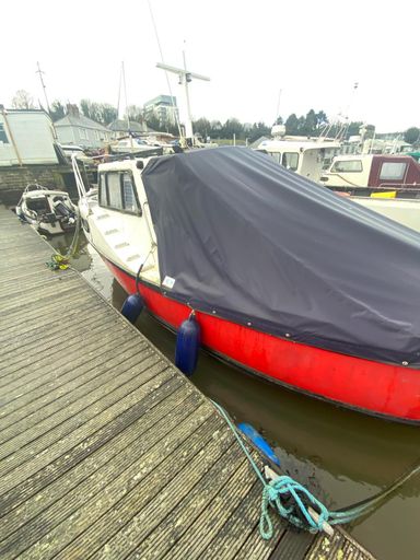 It’s an "Out of Town" IP23-moulds motorboat, very seaworthy but needs a new engine and some smaller jobs (new windows and a bit of paint). The engine was a 1.8 BMC left to an engineer in Essex, you can try chasing it but the current owner gave up due to unreliability of the guy.