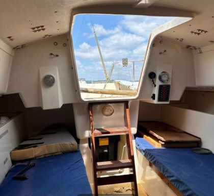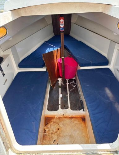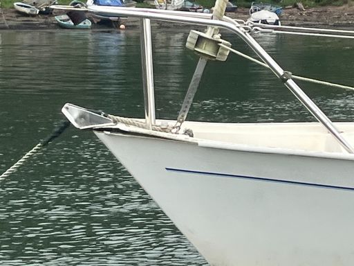 It has no engine. It does have a rudder but needs a new pintle to rehang it. The bow has some small damage. It’s been in the water a long time and needs a good scrub.