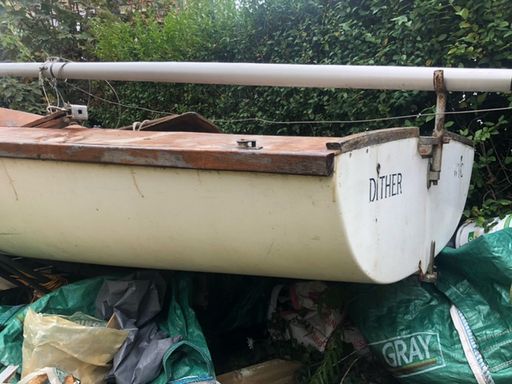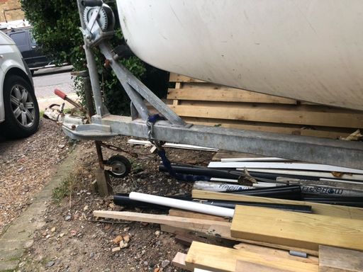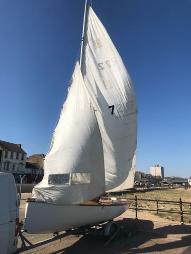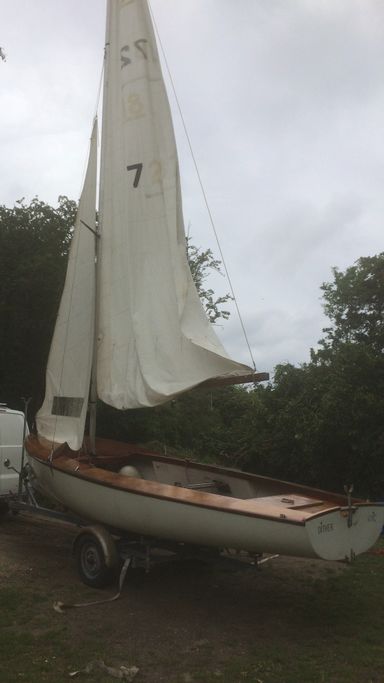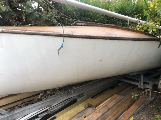 Grp hull, hardwood deck. All rigging and sails, small seagull engine and the trailer. A few decking boards will need replacing.