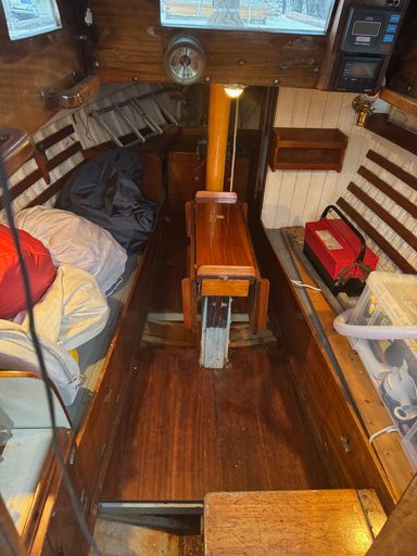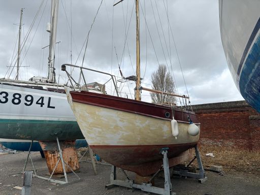 She has been out of the water since November due to a problem with the engine. She does also have a few other issues that need addressing, such as lacquer discolouration on the topsides (as can be seen in the photographs), as well a couple small areas of rot on the coachroof and rubbing strip. It has also been reported that the rigging is of an age to want replacing. This boat comes with 1x Jib and 1x Mainsail, both of the classic-style red cloth.