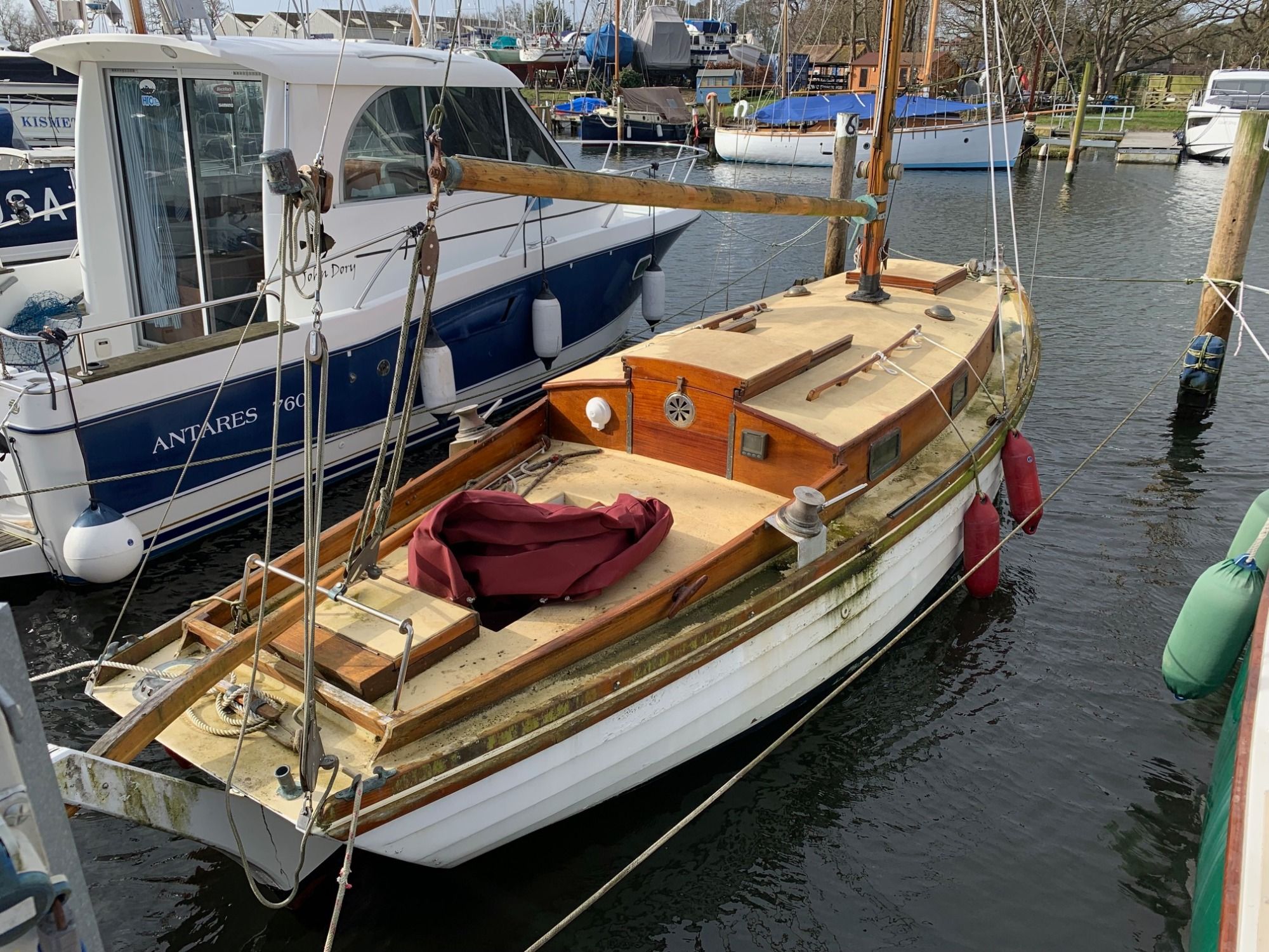 7.8m clinker Spartan design Alan Buchanan wooden classic boat moored at Birdham Pool.