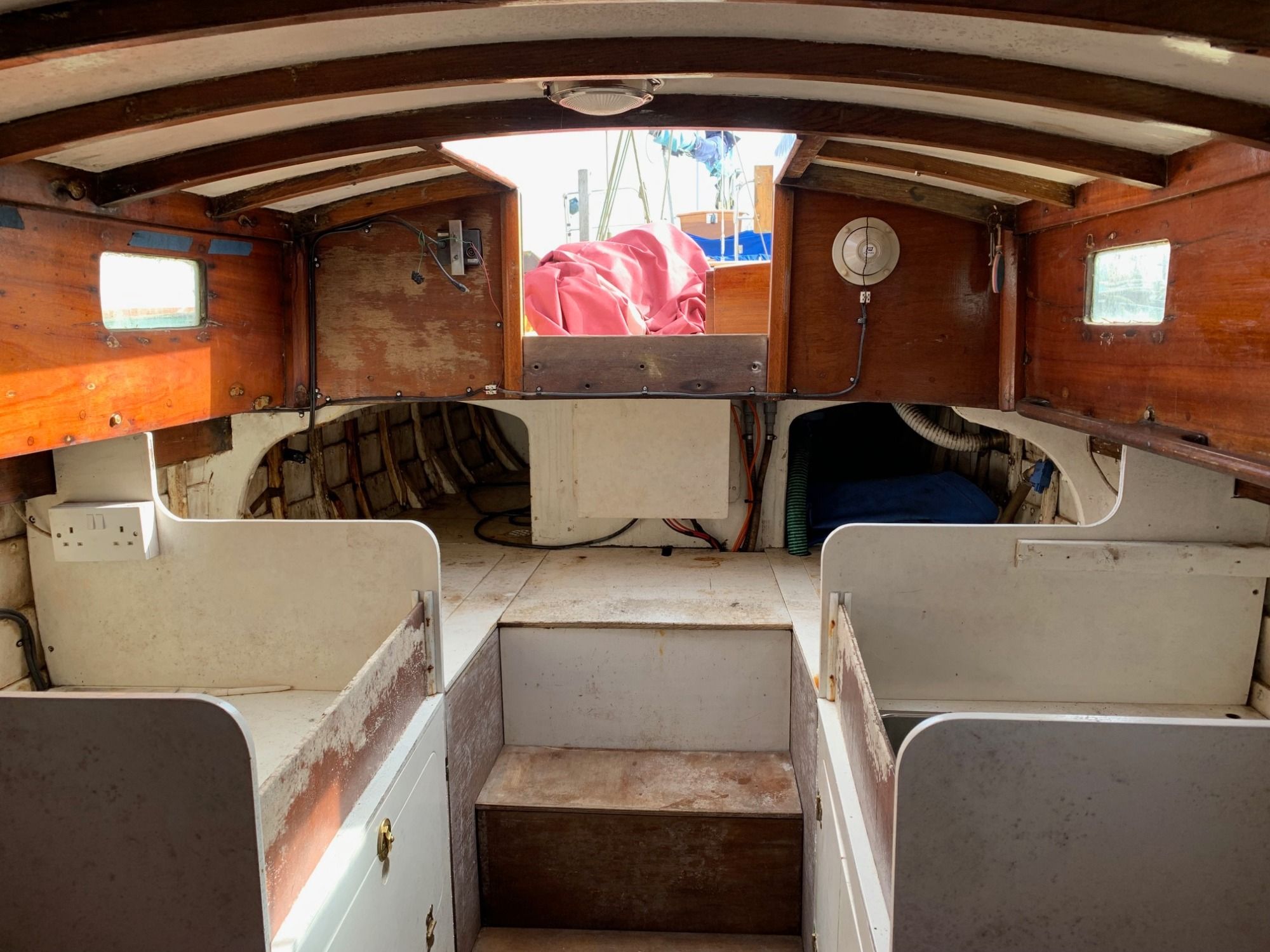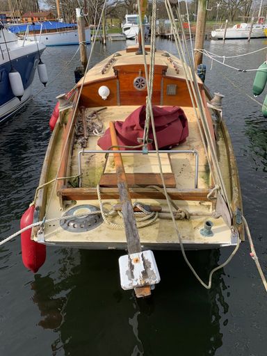 She is clinker planking on steamed oak or rock elm timbers, built in late 1950s or early 1960s. Spars are Sitka spruce, and the mast is stepped on deck. She has a spacious cockpit for her size, but the well does not self drain. Berth cushions and cover new in 2017. Engine was overhauled about the same time, but has not been run since then