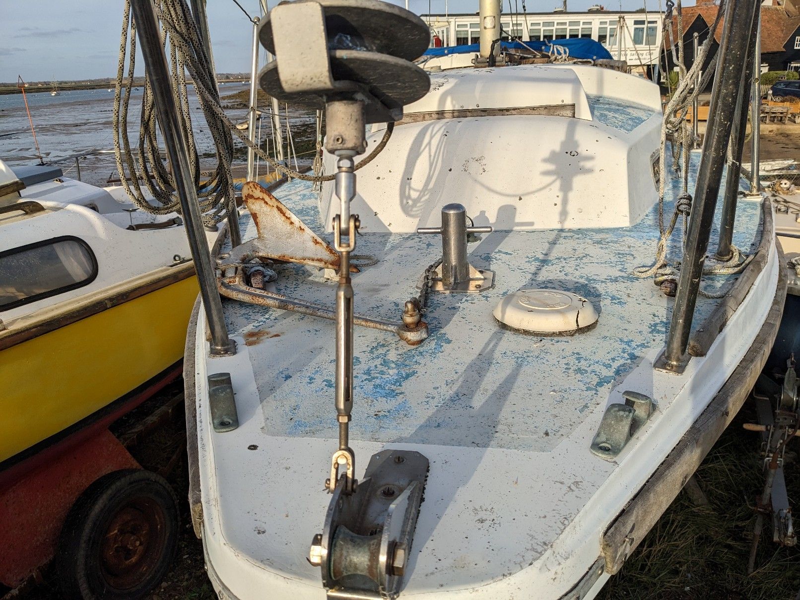 She has been in the family since 1997 but has been sitting in a boat yard at West Mersea for approx 8 years and is in need of some work and TLC to bring her up to scratch but she is fundamentally sound. She had some water laying in her bilge for a while but all flooring and bulkheads are solid and sound but are in need of a good scrub and clean.