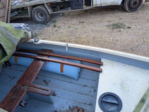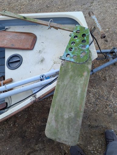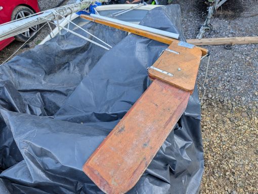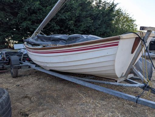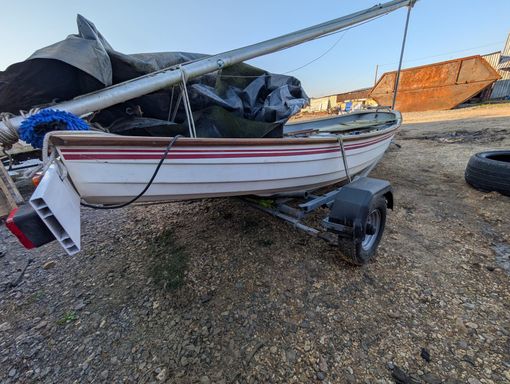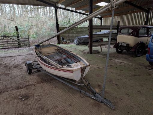 This Slipper dinghy is in delightful condition, so we are trying to find a new home for her. She is built out of GRP, and very sturdy, like many older glass boats that were made as thick as their wooden counterparts. Her last owner kept her barn stored, however she is currently outside under a tarpaulin whilst we try and re-home her. She comes with 2x masts (one slightly taller), 2x booms, 2x rudders and 1x centreboard. She has only 1 sail with her, however after some research I believe they can also take a small jib. She comes on a trolley with flat tyres, but no trailer.