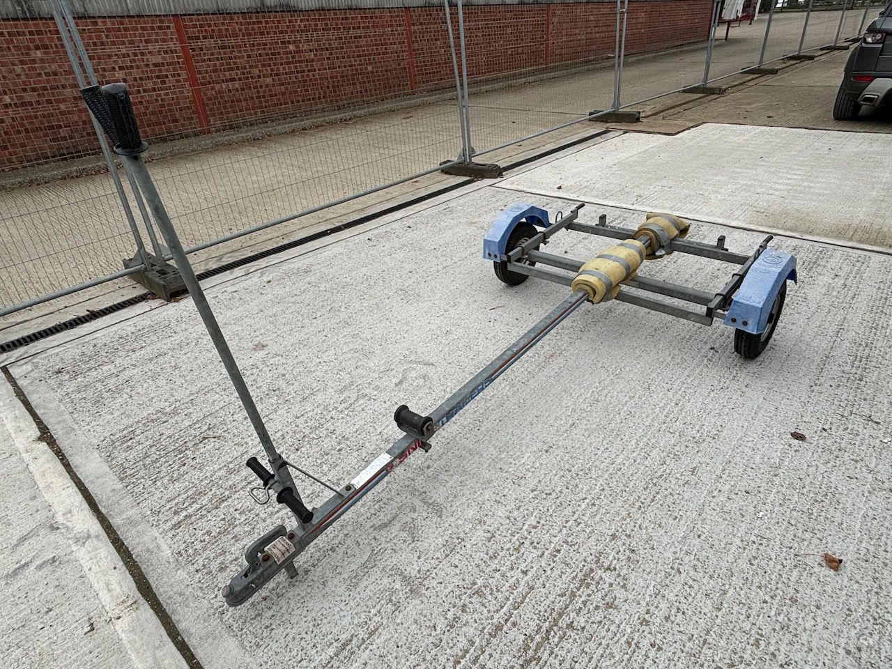 Solo dinghy, sail no. 4915. Composite hull, built by German company Thomas Bergner in about 2004. All standing and running rigging in reasonable order, two tatty sails, two rudders, boom-up cover. Trolley and road trailer in reasonable condition.