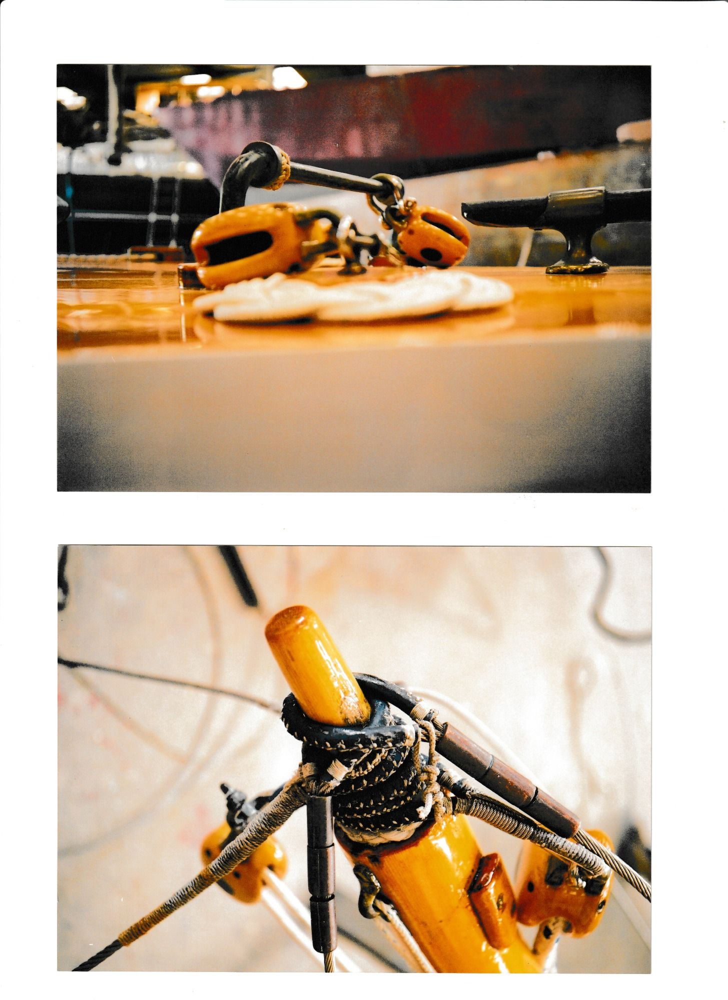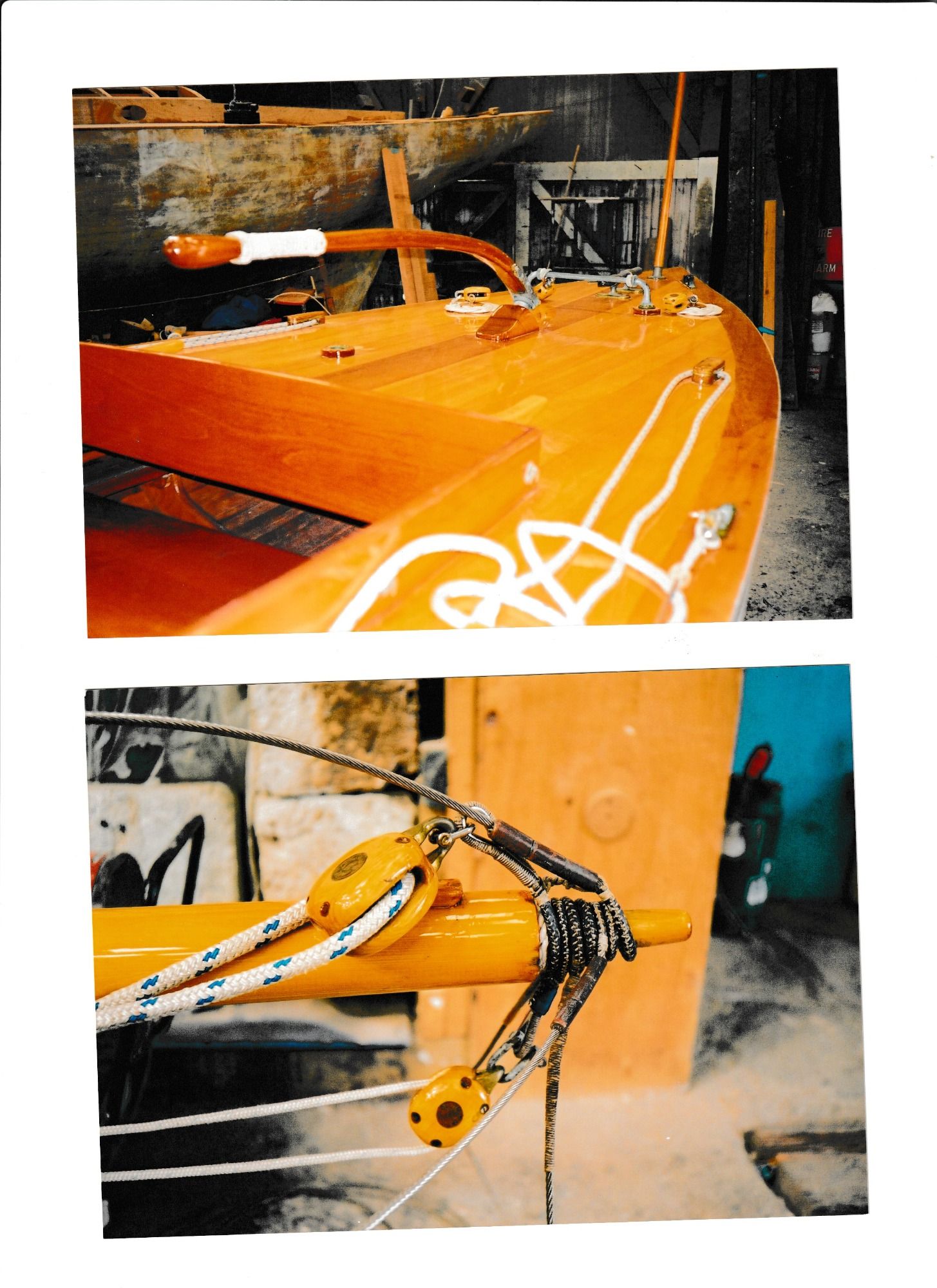 The rig is a gunter (or steep gaffer) sloop with a toral of 260 sq.ft. of sail made in cream terylene by Gayle Heard of Tollesbury. The mainsail has two slab reefs and there are two stay sails. The spars were made by Collars of Oxford and are short enough to store easily in the winter. All the standing and running rigging was done by a traditional Clyde rigger. The spars, as well as foresail and mainsail are still present.