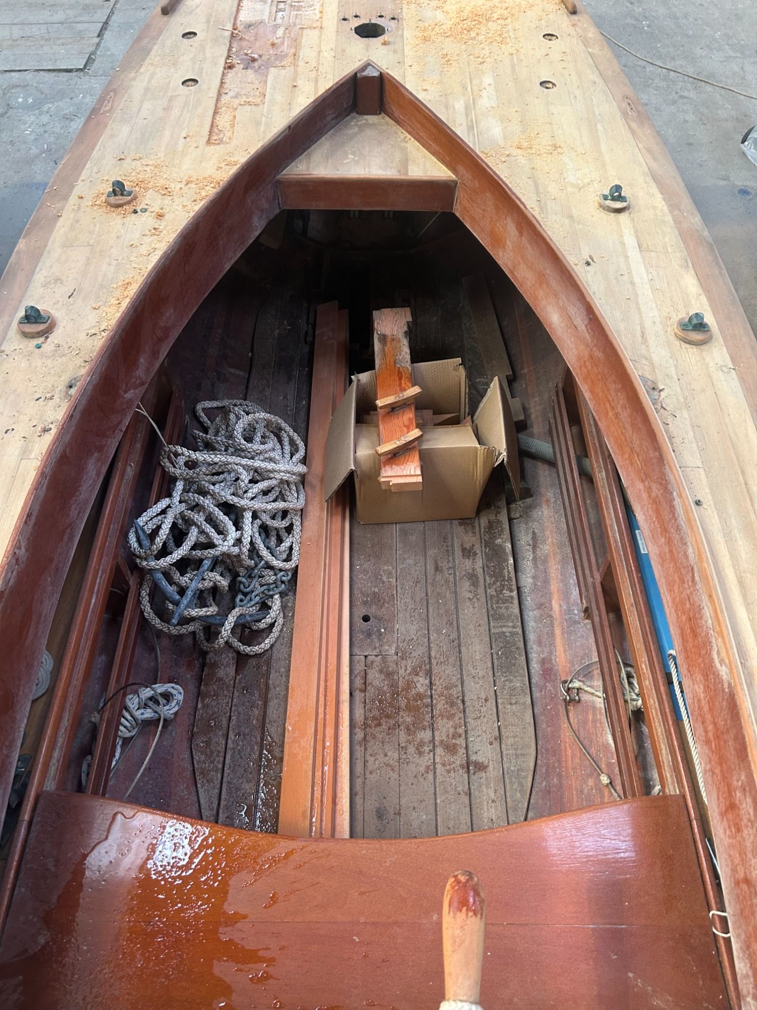 Hull was glued Cedar strip sheathed with cloth and epoxy on Douglas Fir centreline structure. Deck is a Brunzell plywood subdeck on Douglas Fir beams planked with ancient yellow pine and mahogany covering boards and kingsplank. The topsides were painted with Blakes two pack polyurethane, the bottom was treated with copperbot and all brightwork in Schooner varnish. The lead keel was cast by Henry Irons from a piece of KENTRA'S original lead keel from 1923.