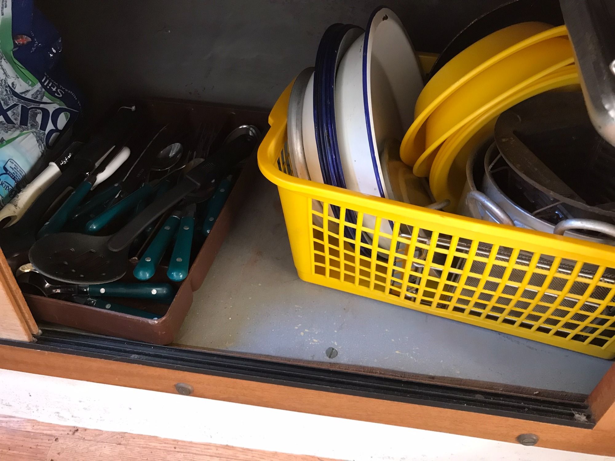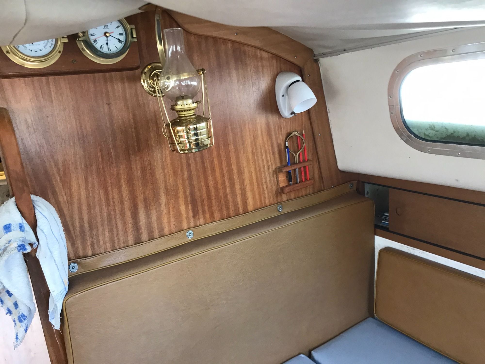 The mainsail is on the boom. There are 3 foresails - no1 jib, no3 jib and a cruising shute. Two anchors - Danforth at front (chain in chain locker in bow) and spare plough at rear. Couple of life belts. Depth sounder/speed, GPS, VHF, Autohelm Jabsco toilet.