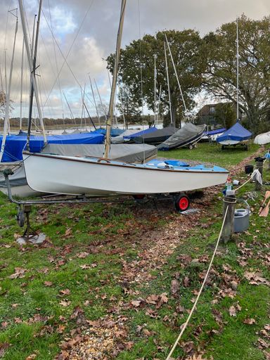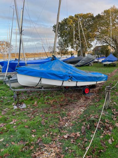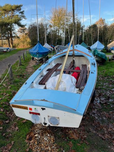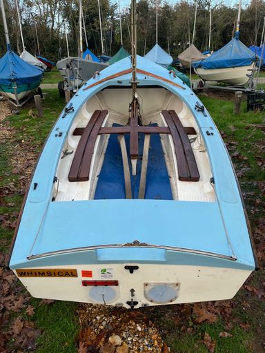 'Whimsical' is a GRP constructed boat with wooden foils. She has a cover which is starting to split, and a single set of sails (main, jib, spi) in decent condition. From the colour of the spars you can see she is not the newest boat on the market, but she is ready to sail and ready for a plethora of adventures. The GP14 fleet is a strong fleet in the UK, with an active website/forum. She has a tricycle style launching trolley, she does not have a trailer. She comes with spare rudder + tiller and a couple extra random bits. Link to the GP14 association website https://gp14.org/